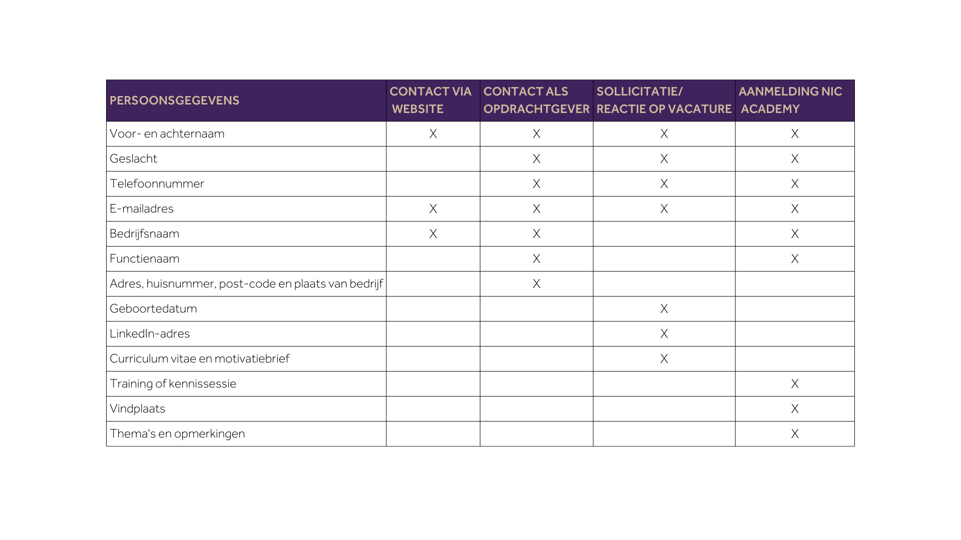 Een alternatief voor de website is dat u uw gegevens per e-mail naar ons toestuurt, dat wij uw openbare profiel downloaden van LinkedIn of dat wij uw cv via een andere weg aan onze database toevoegen. Bij het eerste contact, anders uiterlijk binnen een maand na het ontdekken van uw openbare profiel op LinkedIn of het ontvangen van uw cv via een andere bron, vragen wij u of wij uw profiel in onze database mogen verwerken voor onze dienstverlening.